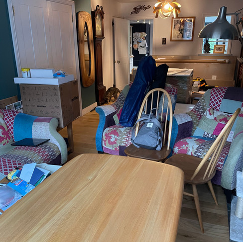 Today our Ercol furniture arrived - we had expected that the bathroom would be nearly finished by now so for the moment they are just added everything else - now taking up space in the sitting room area! It is really full, no space and no way of finding anything! Also today is Freya day and she is very happy today!! Loves hiding her toys and suprising us by finding them!! And then we went to pick up the Ikea wardrobe that we had ordered - just more to add to all the stuff!