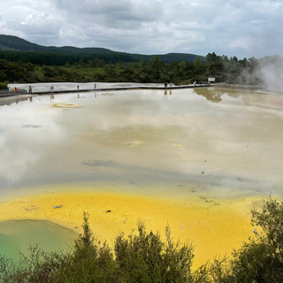 We drove further along, it’s a strange place with random steam coming out of the ground! We stopped at the thermal wonderland, which is much better than the name suggests! They have set out a series of walkways through a literal thermal wonderland! Boiling mud pits, steam from the hot water bubbling up and wonderful colours where evaporation has happened. And a terrible rotten egg smell! It was an amazing landscape. 15% of New Zealand’s power comes from geothermal energy with one third of that coming from this valley. We finished at a bright green lake, absolutely stunning. With a ph of 2 it’s even more acidic than the other pools here.